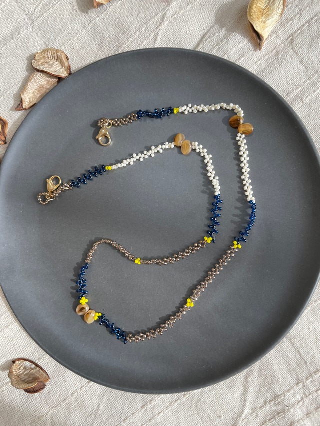 男女問わずご使用いただけるマスク&メガネチェーンシリーズ。 今や必需品となったマスクも、ファッションの一部として楽しめるアイテムです! こちらはシンプルでありながら編み目にこだわりが詰まった作品です。 グレーブラウン、オフホワイト、ネイビー、イエローのビーズを使用しております。 ご購入の際はマスクチェーン、メガネチェーン、両用タイプの3種類から1つをお選び下さい。