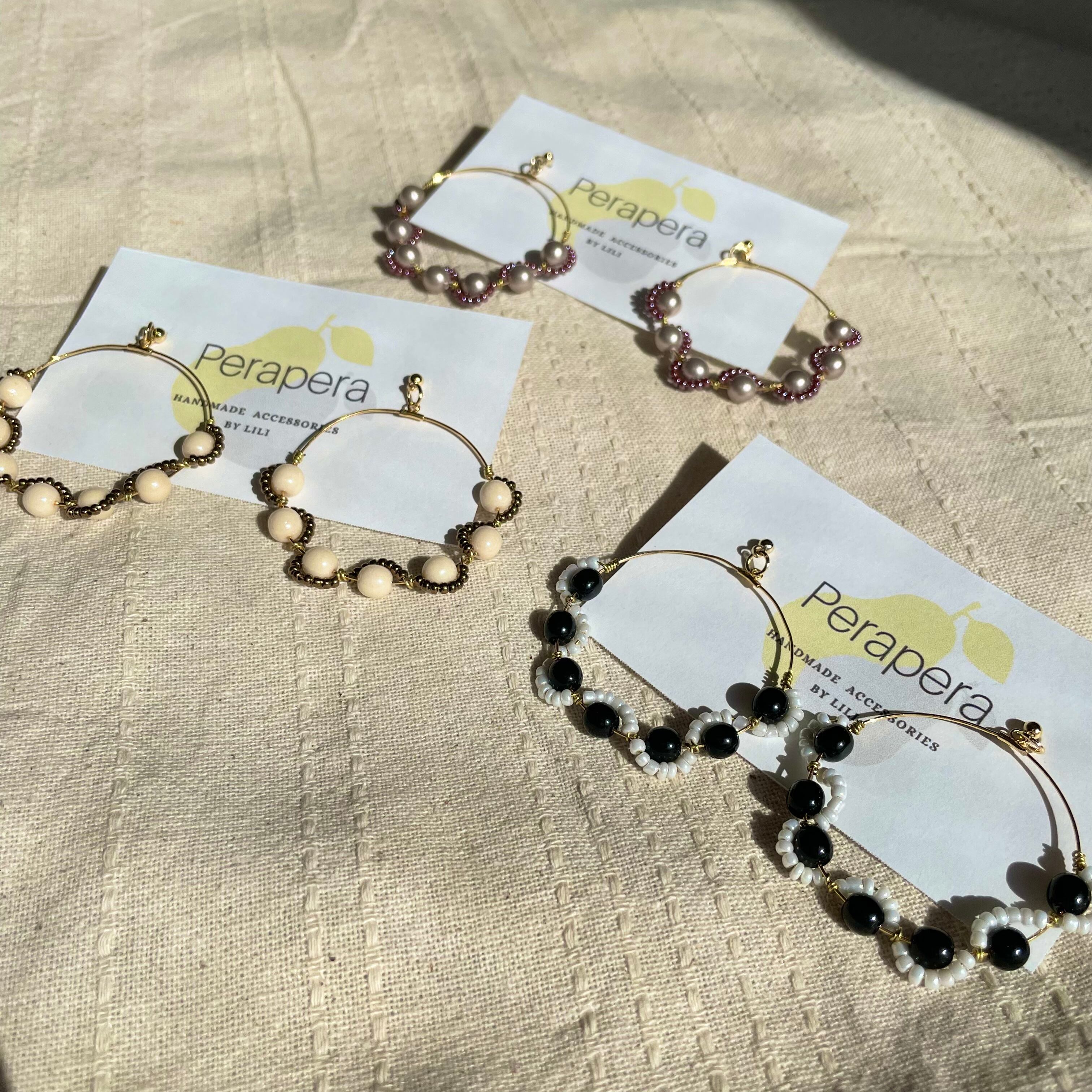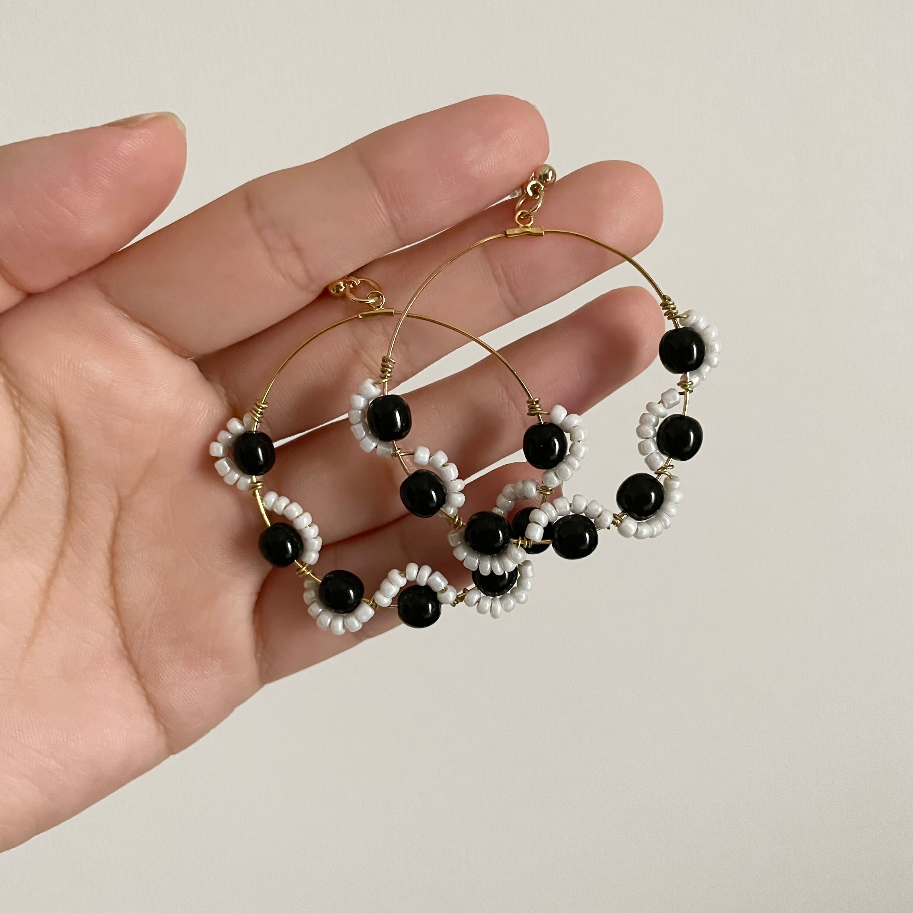 ブラックのチェコガラスビーズの周りに光沢感のある白のビーズを波のようにあしらったピアス。