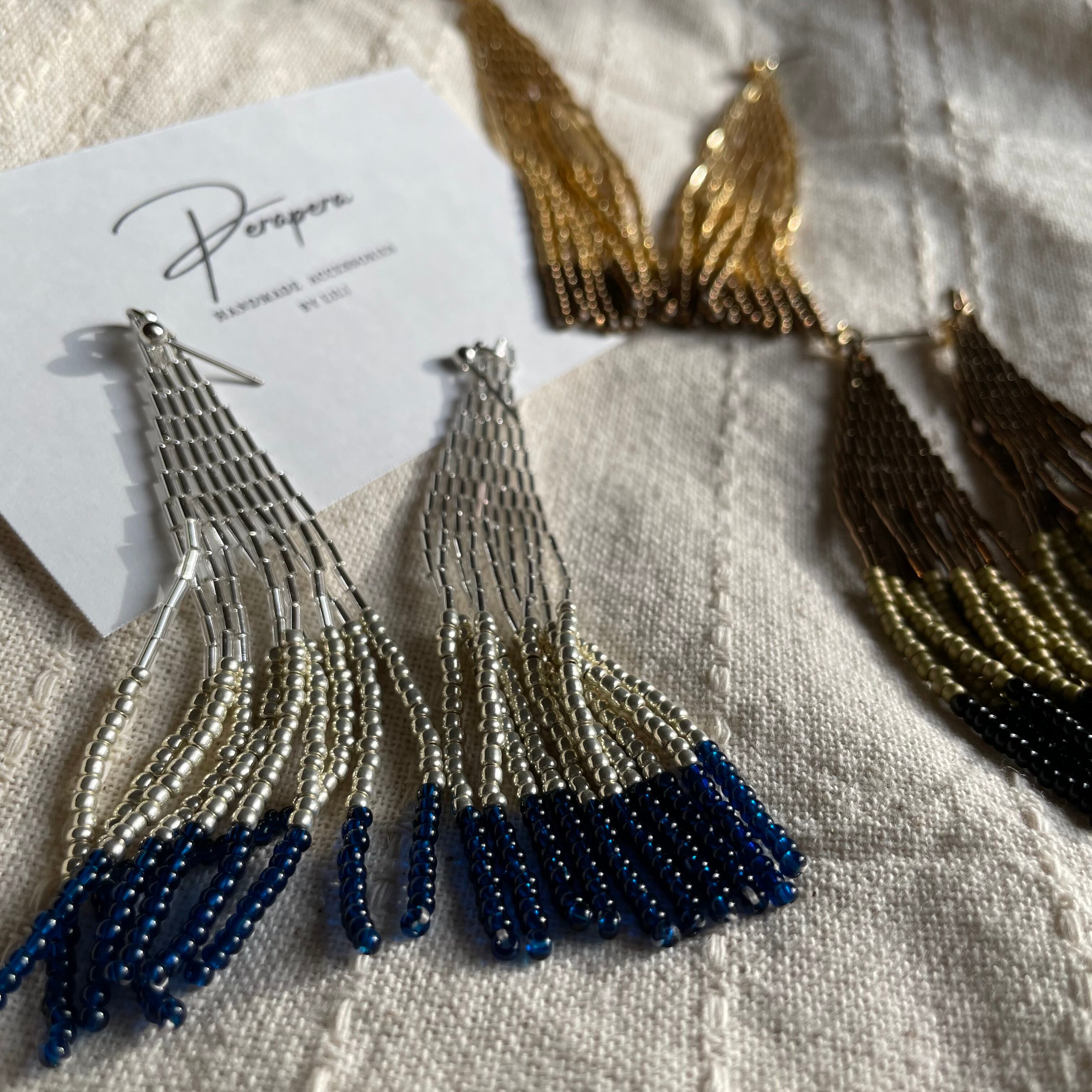 ビーズを1針ずつ編んだロングタッセルピアスです。