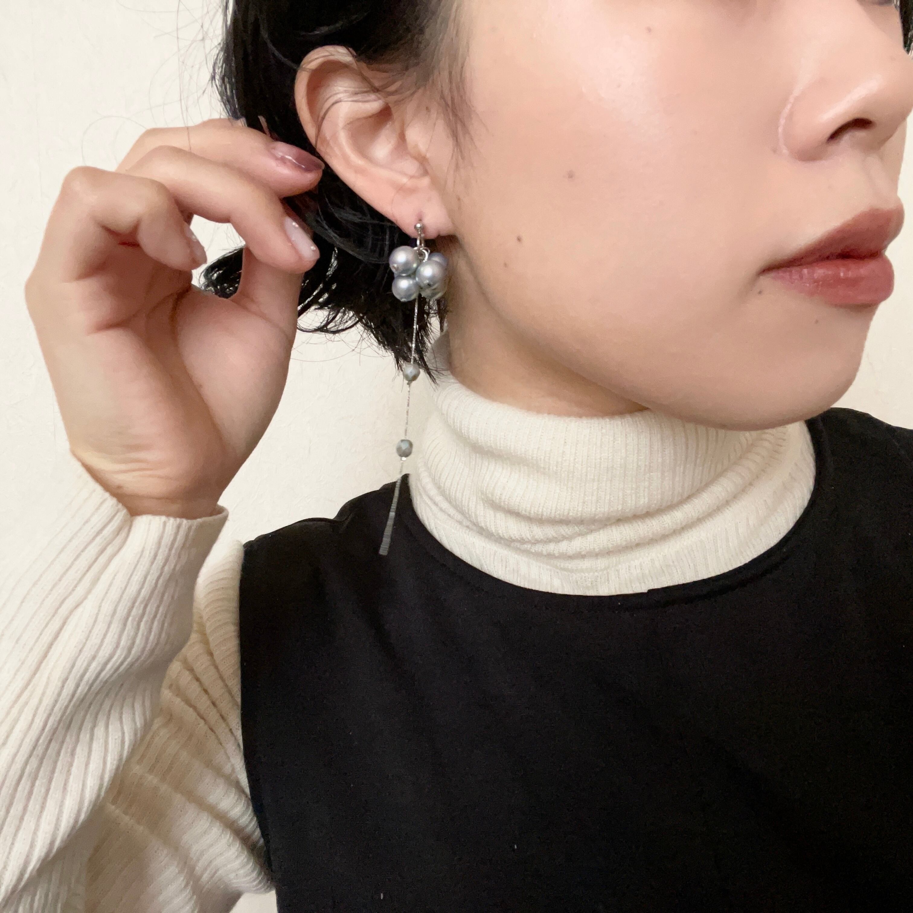 シルキーカラーのパールとスラッと長いチェーンを組み合わせたピアスです。
