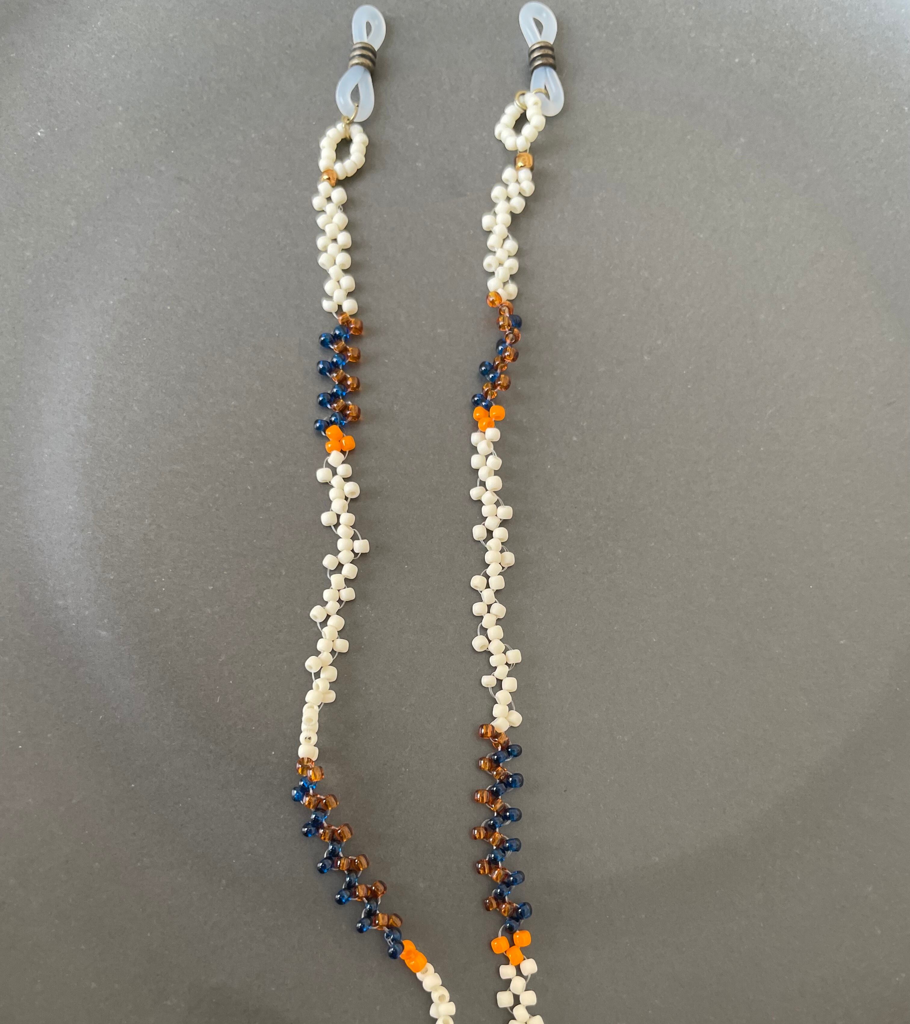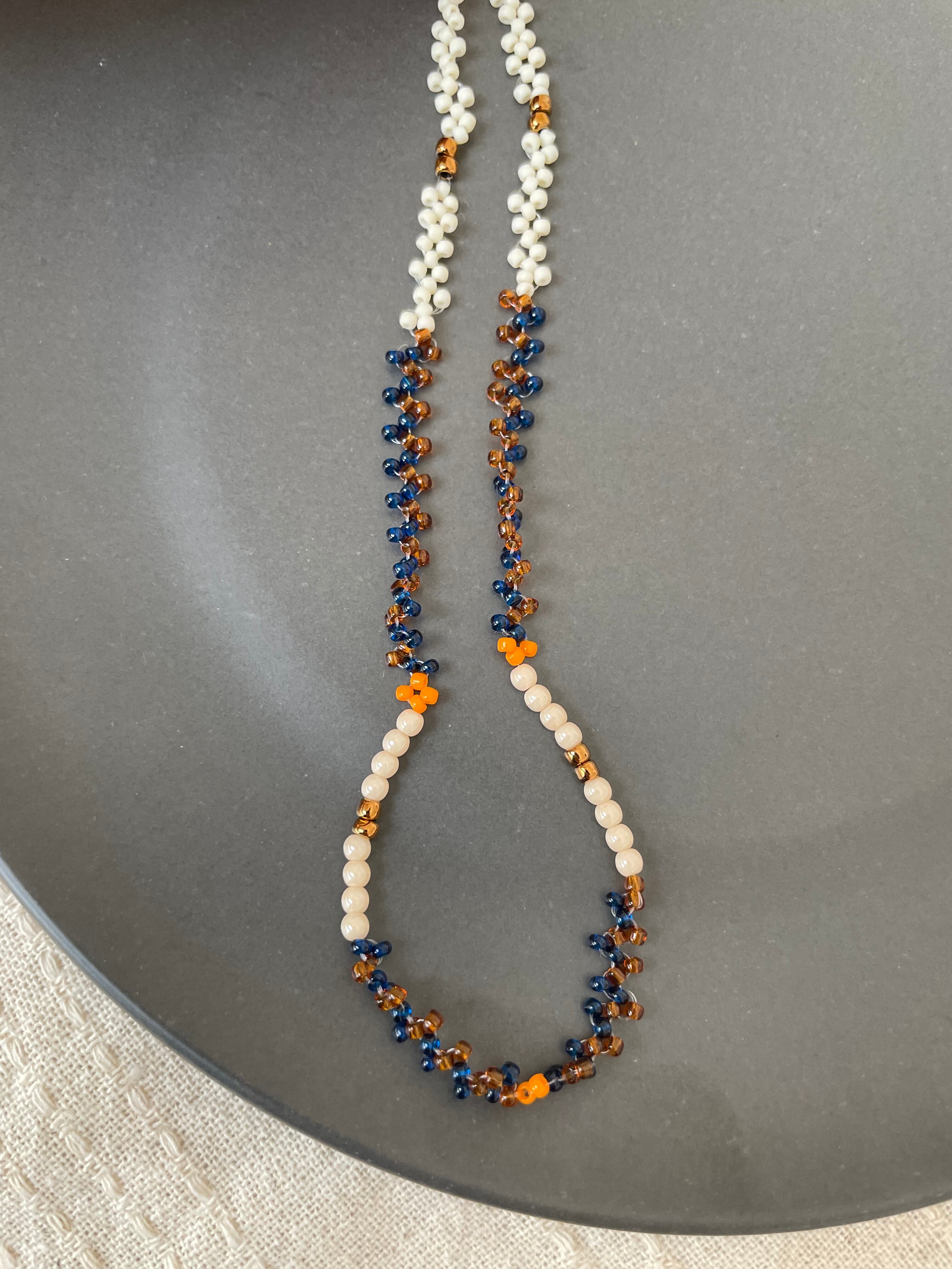 こちらはオフホワイト、ブラウン、ネイビー、オレンジビーズを使用しております。