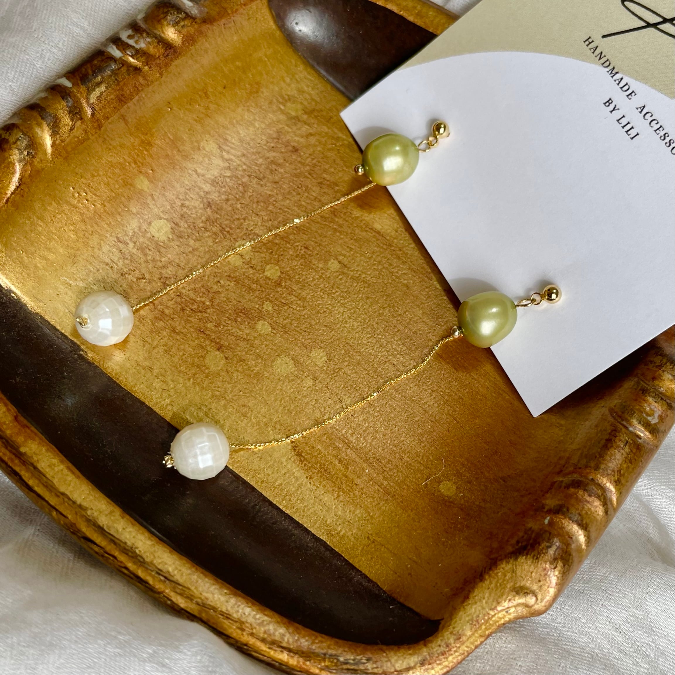 ピアスキャッチから下がったチェーンの先にはミラーボールの形のパールをあしらったピアスです。