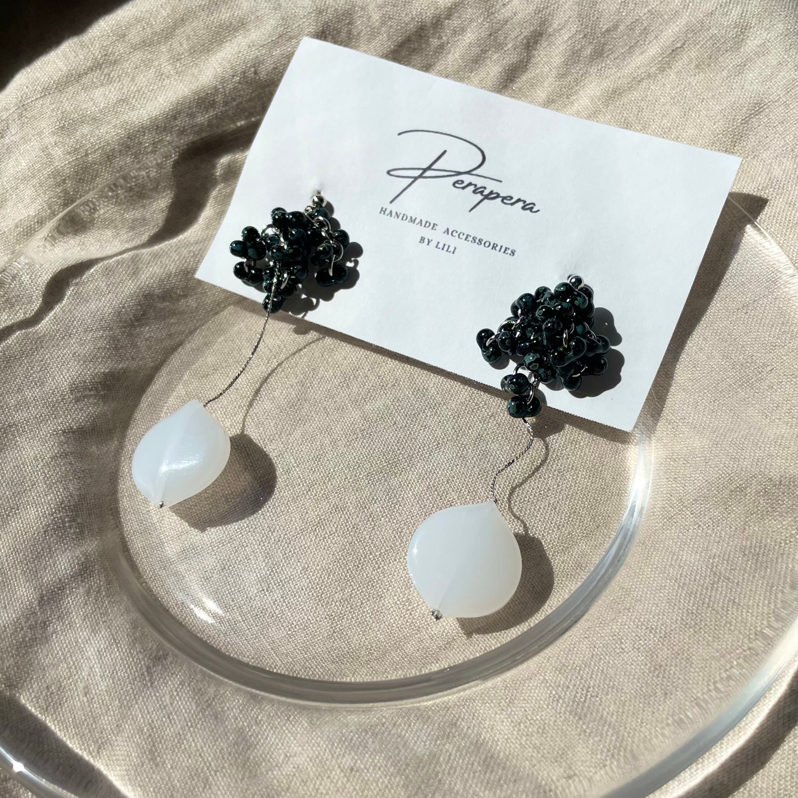 個性的な形のヴィンテージビーズを使用した、黒と白のコントラストが目を引くピアスです。