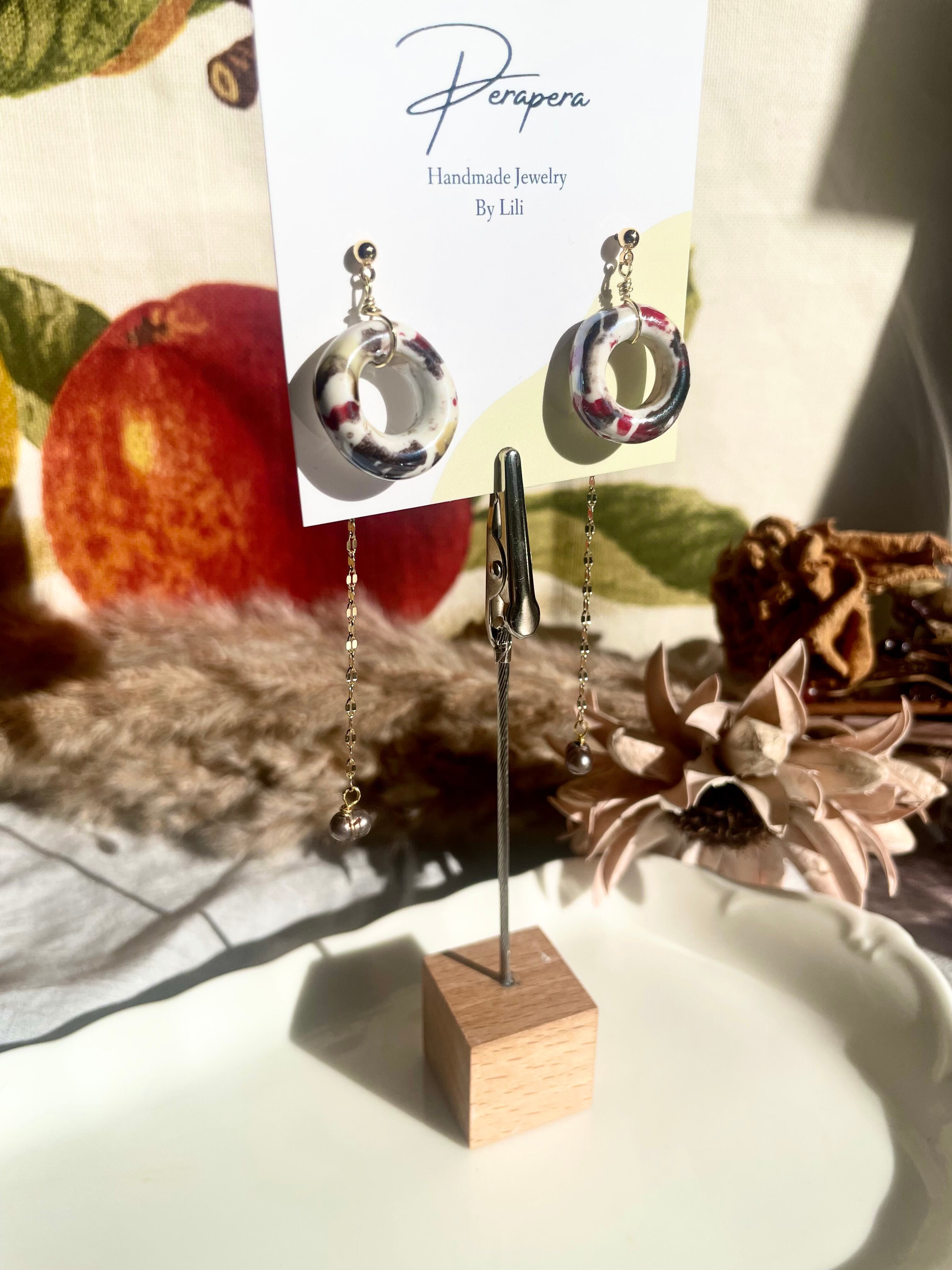 Material: ceramic beads, fresh water pearl, gold plated wire, gold plated chain, gold plated ear posts