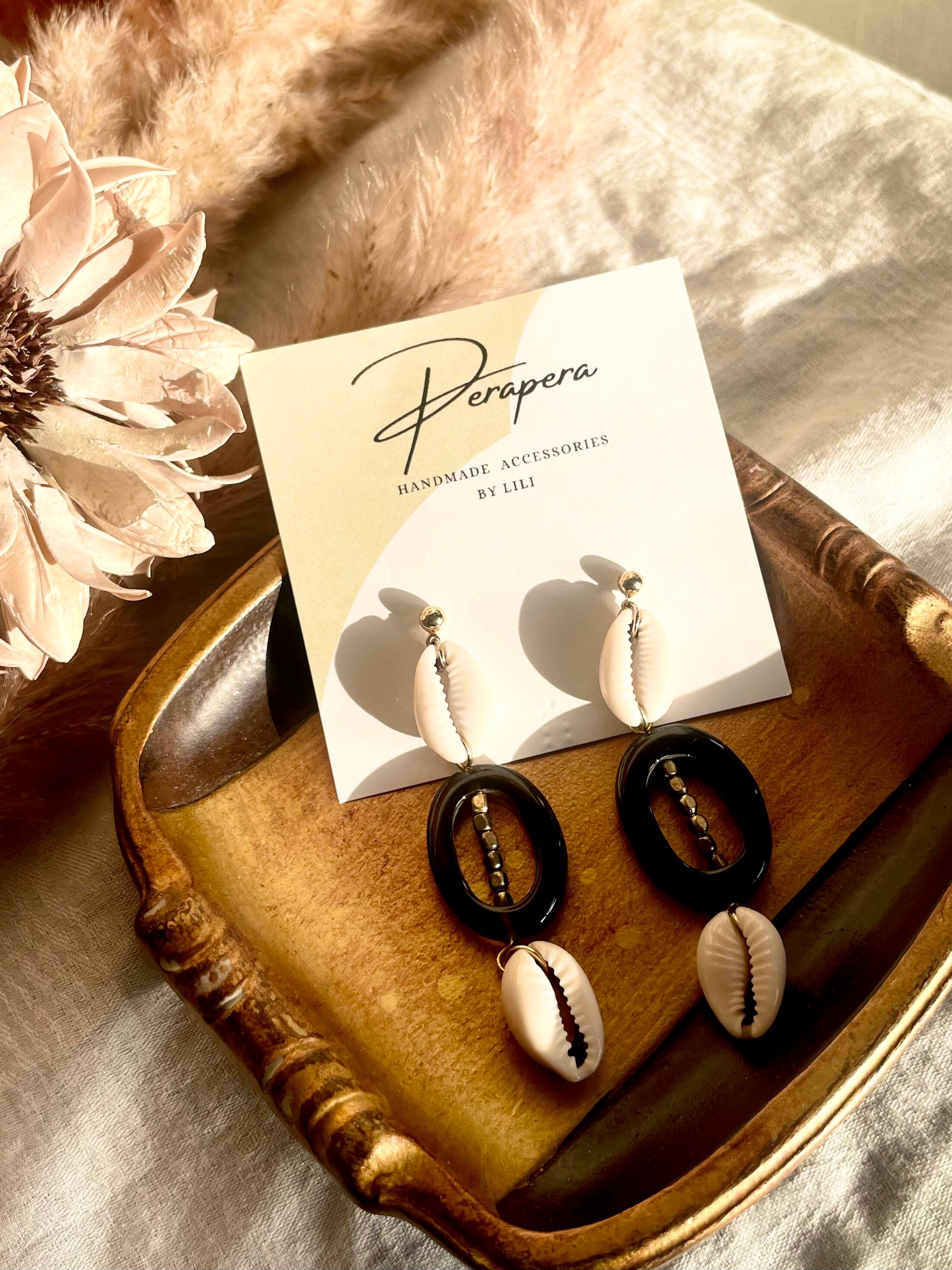 天然のシェルとナチュラルストーンのブラックアガテを使用したピアス/イヤリングです。