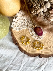 Material: glass beads, gold plated ear hoops, gold plated wire, resin