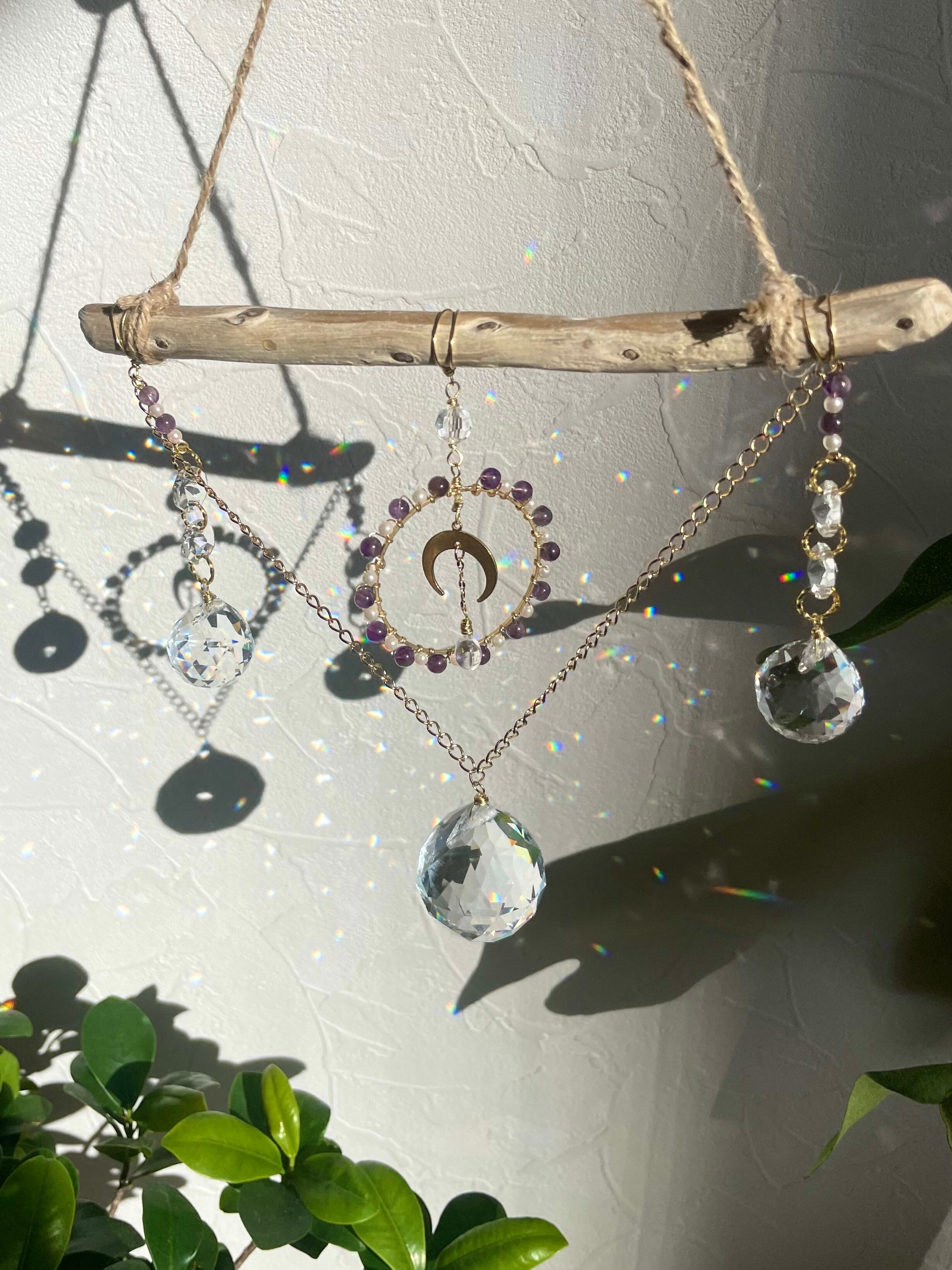 アク抜き処理を行った流木を使用したサンキャッチャーです。アメジストとパールビーズで編んだフープの中に真鍮製の三日月型チャームをあしらいました。